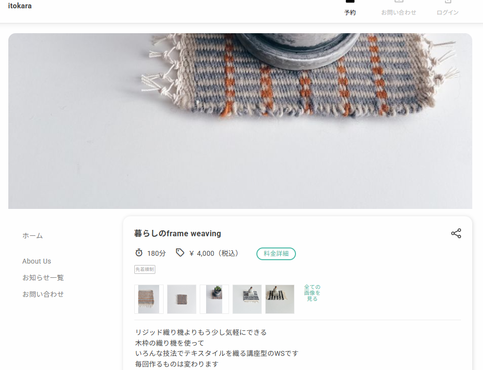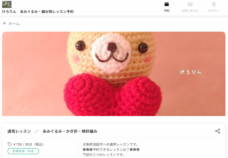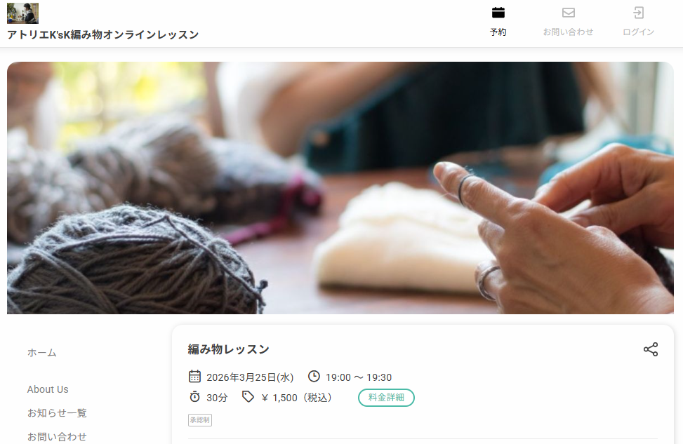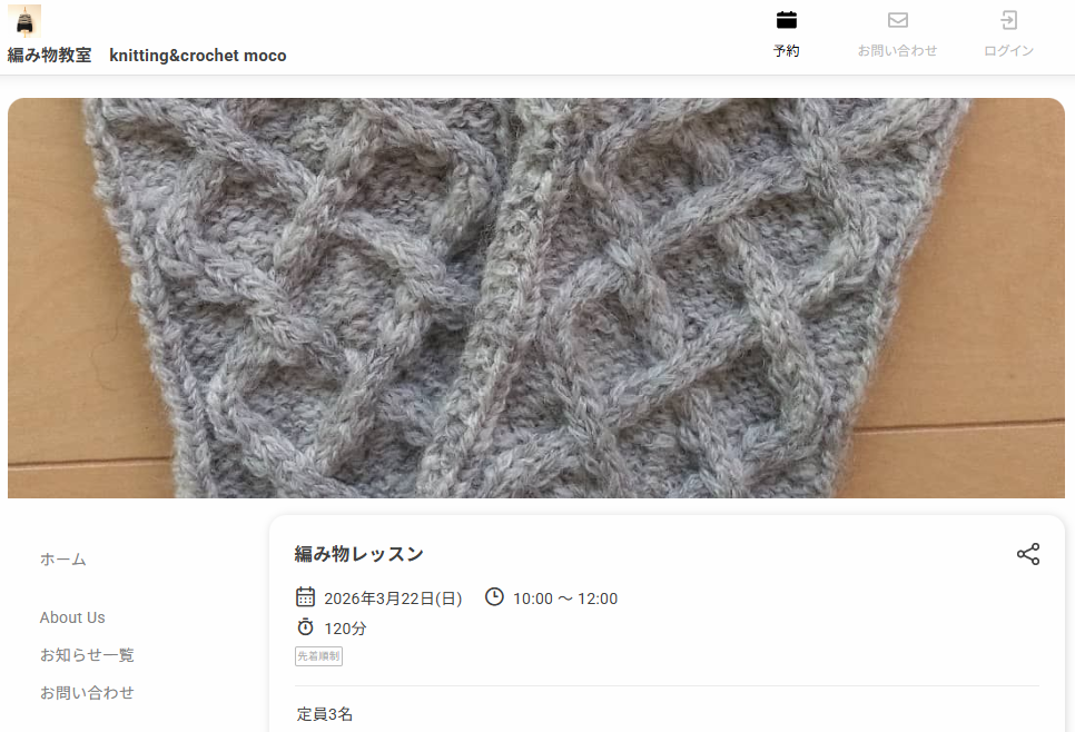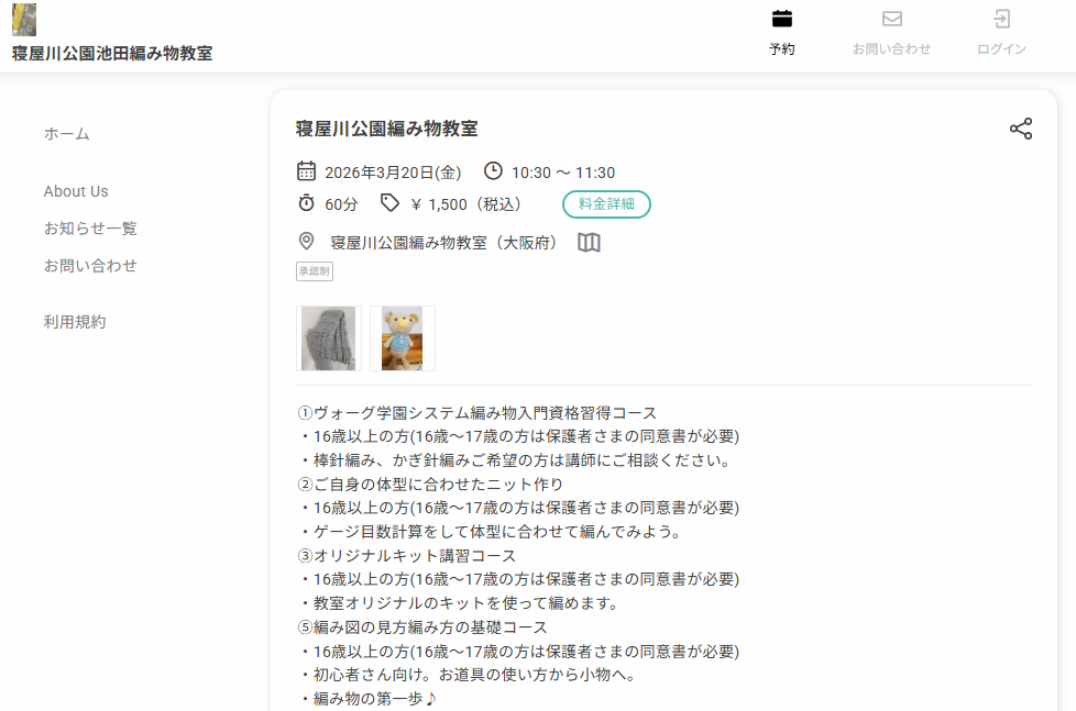 予約サイトのメニュー欄では、編み物レッスンを受け付けています。また、予約の流れは先着順制となっており、予約をした時点で自動的に予約が確定される仕様です。