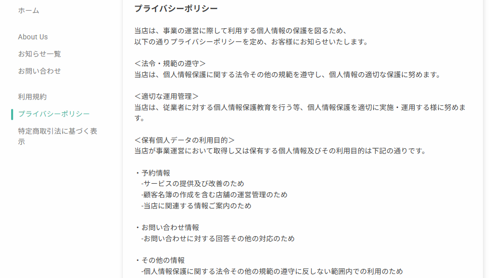 予約サイトには、プライバシーポリシーが掲載されており、受講者は事前に利用規則を確認できます。加えて、お問い合わせの欄では疑問点や不明点などを運営者に共有することも可能です。